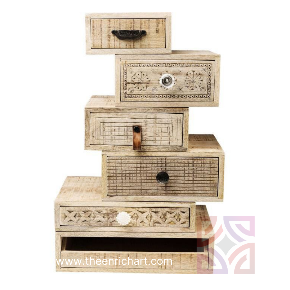 Hand carving remains one of the most ancient and revered Indian arts. This product is an epitome of the finest craftsmanship from Rajasthan, India. The lacquered wood finish exemplifies it’s unique style. This chest of drawers, carved out of mango wood compliments all spaces. The fine quality and extraordinary finish makes the product stand out. The minimalistic style with an interesting range of patterns adds another dimension to a variety of spaces like bedrooms, living rooms, commercial spaces- restaurants, boutiques, offices, guesthouses, resorts etc.